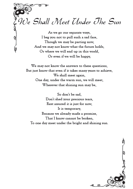 A good friend of mine who I allowed to read my poem, about almost 2 years ago, said it sounded to her like I was writing a suicide note, lol. 😀 Do not worry. It is not anything like that. I’m still alive, right?! Lol. This is just a poem about a person and friend, who is leaving their loved one(s) behind but yet at the same time promising to someday meet again under the sun, wherever that sun may be shinning.